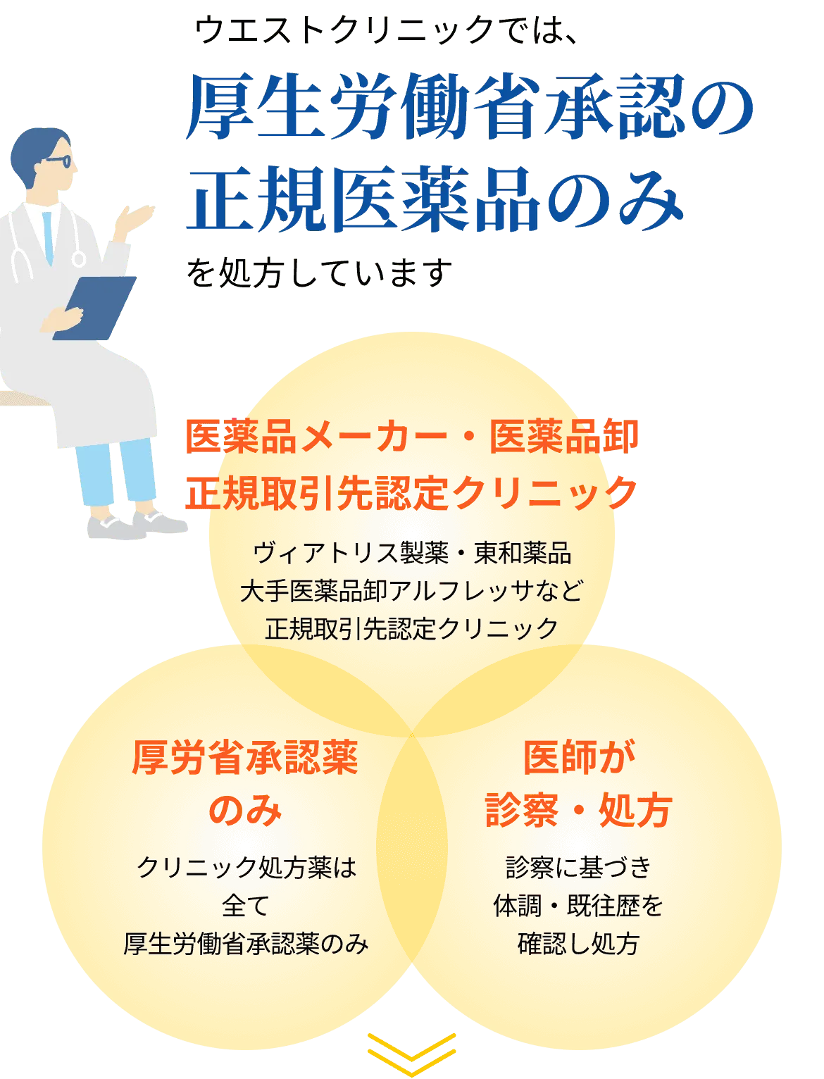 ヴィアトリス製薬、東和薬品、大手医薬品卸売のアルフレッサとの正規取引認定クリニックです。 海外輸入品や偽薬の心配はありません。